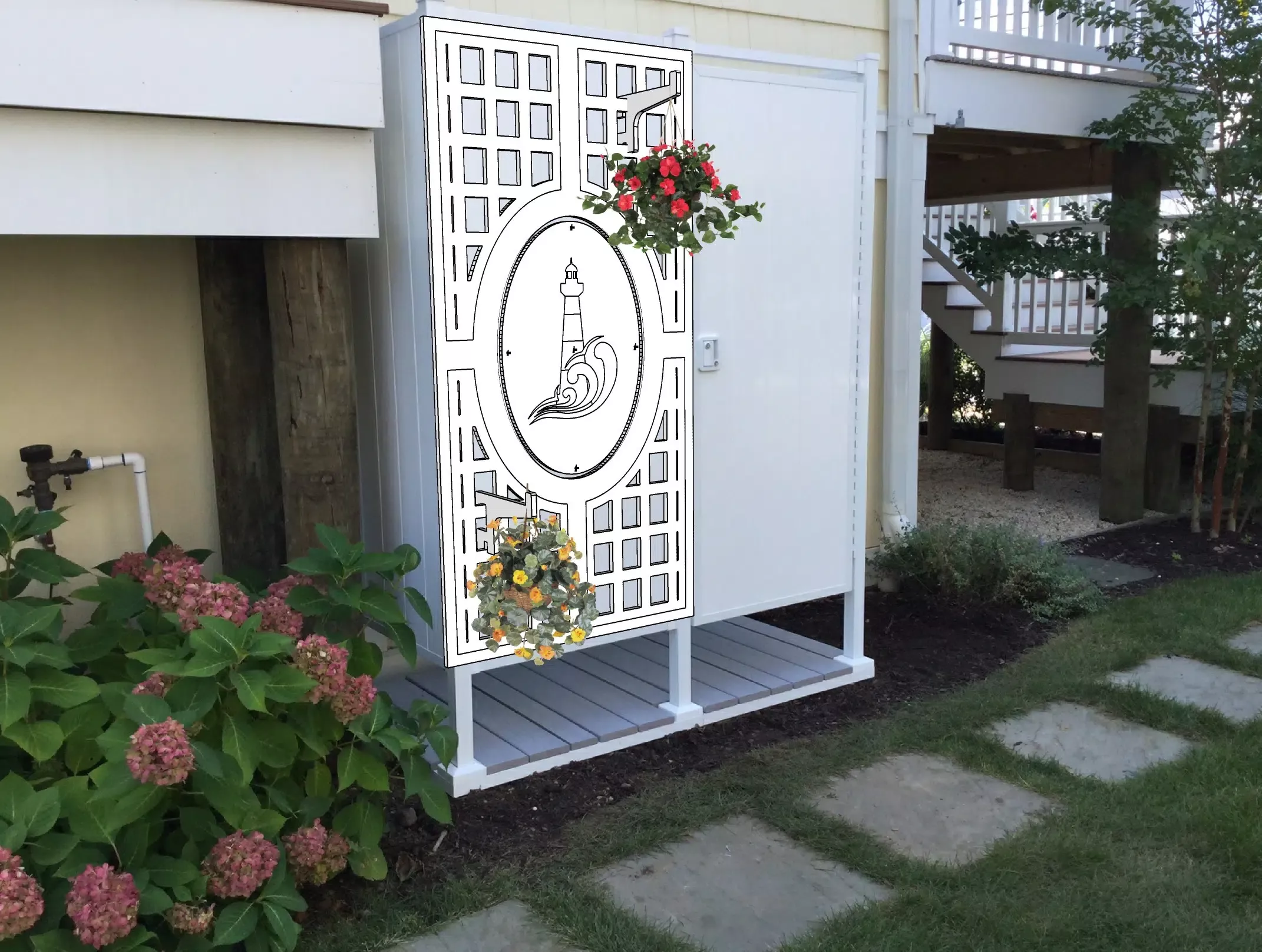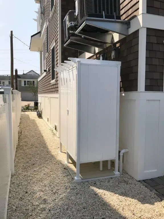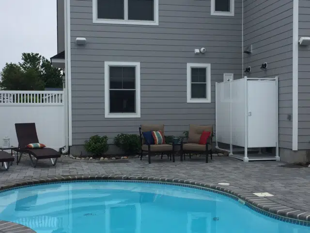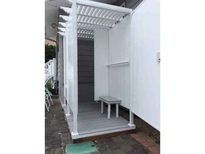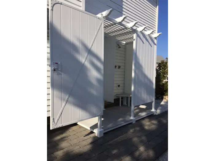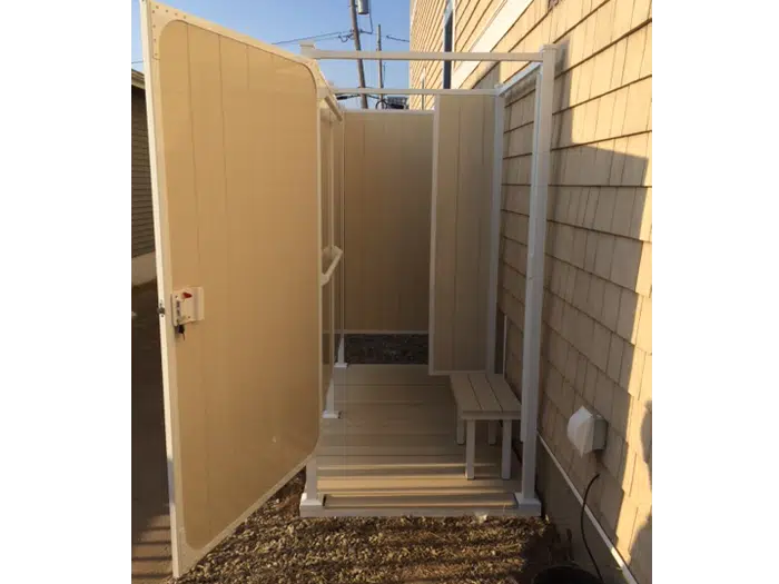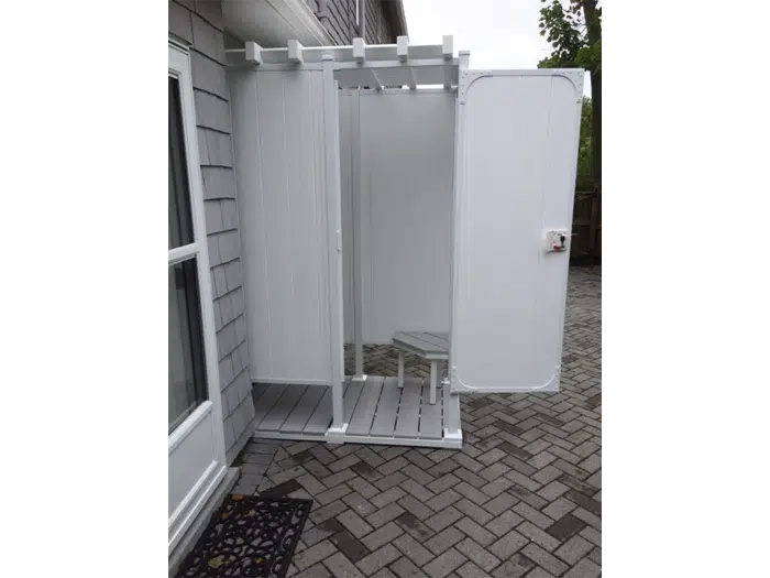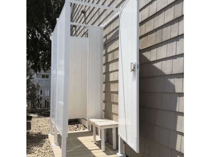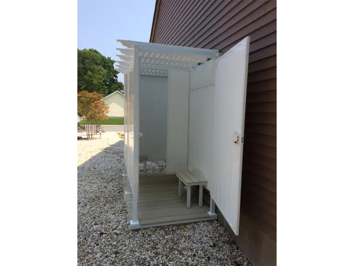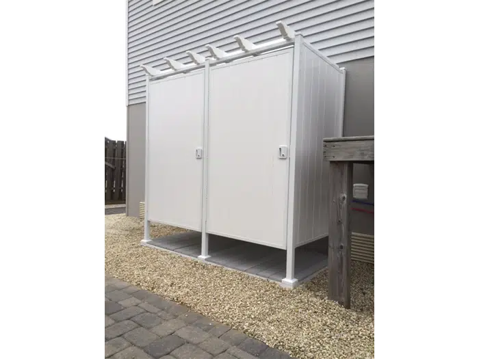 For easy and convenient outdoor shower kits, our outdoor double shower stalls provides you with the convenience of a changing room separated by a partition wall to keep your clothes dry while being secure and private. The door can be placed in any location on the unit and can be opened in any direction to suit your needs.